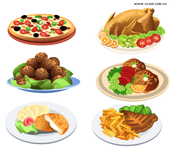 eps format, including jpg preview, keyword: Vector food, pizza, Pizza, chicken, meatball, steak, fries, dishes, food, catering, vector material